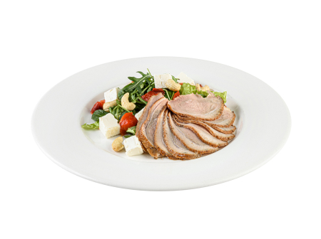Салат с копчёной утиной грудкой, печёным перцем, салатным миксом и сыром фета под растительной заправкой