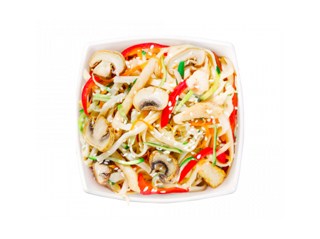 Лапша удон, цыпленок, шампиньоны, капуста, морковь, перец болгарский, огурец, лук репчатый, терияки соус, кунжут