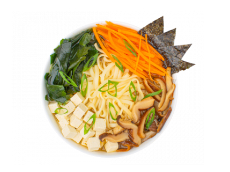 Лапша удон, мисо бульон, грибы шиитаке, сыр тофу, морковь, лук зеленый, водоросли вакамэ, нори
