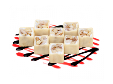 Тесто харумаки, грецкий орех, банан, мёд, сыр сливочный, сироп шоколадный, сироп клубничный